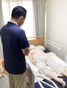 今回紹介させて頂く利用者様が使用している介護ベッドは寝ている状態から座位、立位への姿勢の変換をボタン操作のみで行ってくれる様式になっています。